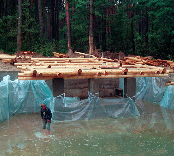 Сначала была вырыта и забетонирована чаша бассейна. В той части его, где предстояло "нависать" бане, установили сваи. На них были уложены балки, выполнена гидроизоляция, настлано черновое основание и на него положены бревна.